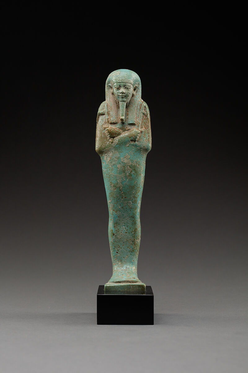 Discovered in 1903 in the tomb of the Overseer of the Royal Fleet, Hekaemsaf, this shabti, one of a set of 401, exemplifies a high point in the manufacture of such funerary figures. The mummiform shabti stands on a low pedestal; this, and the shallow pilaster behind echo the form of a statue. The long wig and curled beard are markers of divinity, indicating that Hekaemsaf has been transformed into a being capable of participating in the afterlife. The agricultural tools he holds—a pick in one hand, a hoe in the other, and a basket slung over his back—prepare him to carry out labor in the afterlife should he be called on to do so by the gods.