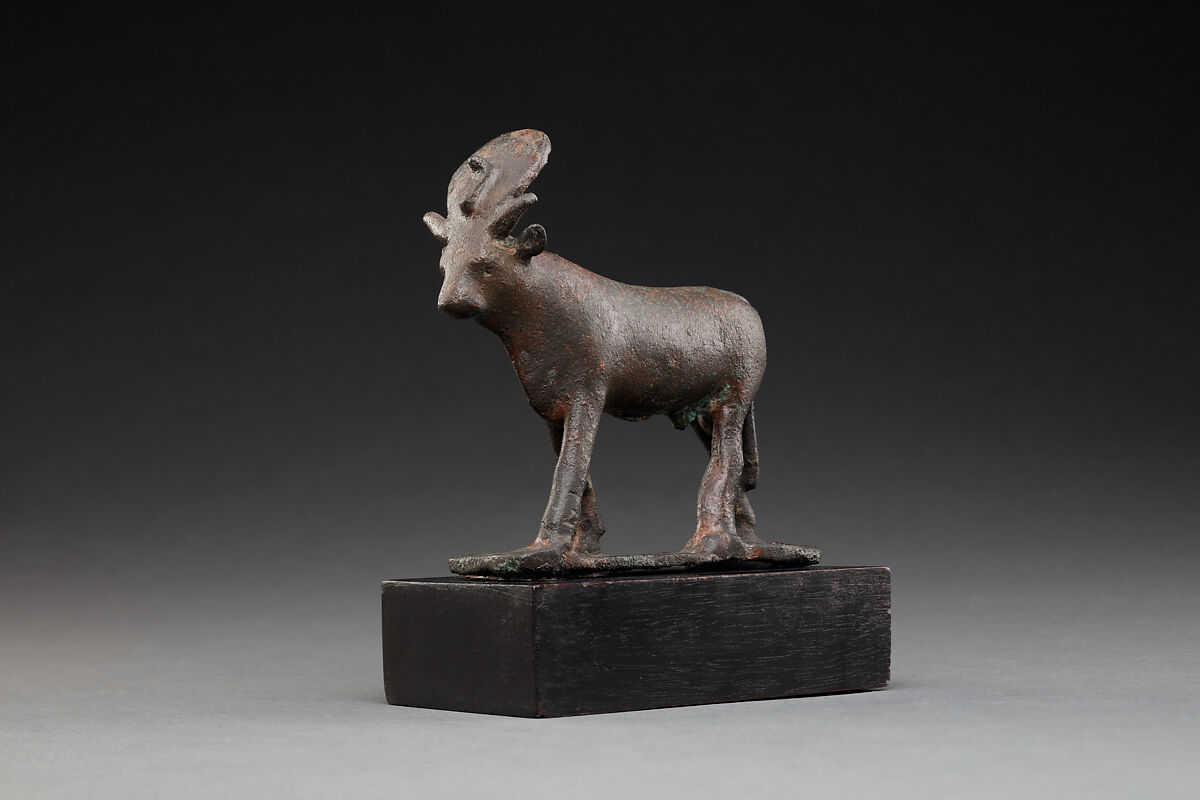 Although uninscribed, the sun disk and horns identify this figure as the image of a sacred bull, most likely the Apis. Such figures come in a variety of sizes and qualities, and can be decorated with trappings such as engraved blankets or amulets. Inscribed examples show that they were often dedicated to the god by specific people wishing to share in the cult. This example might represent an offering from a less wealthy patron.