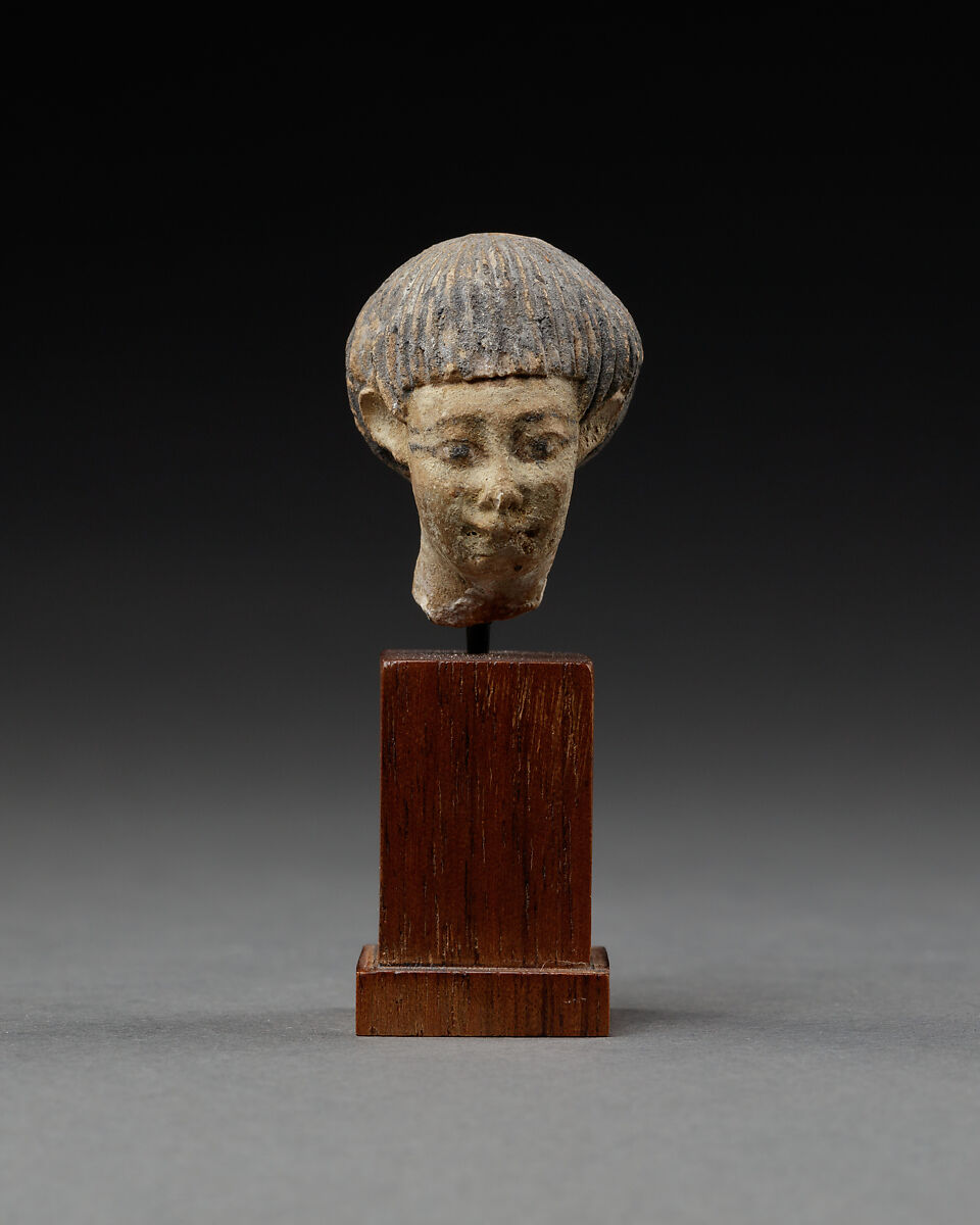 The hairstyle worn by this small female figure brings to mind the short round hairstyle that was in fashion for women during the Late Period, although in a plainer and more voluminous manner. The material used to create this figure could be Egyptian faience, a ceramic-like material usually covered with a colored glaze, although only further examination will determine its exact nature.