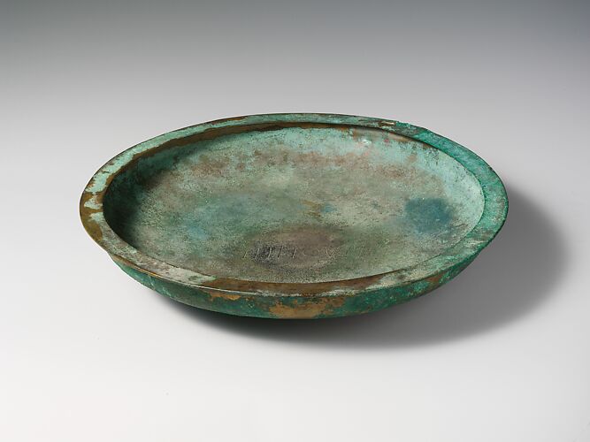 Bronze shallow bowls, or paterae, with figural handles were produced in Greece as well as southern Italy in the late 6th through the middle of the fifth century B.C. and were used for offerings and libations. This finely worked handle takes the form of a nude youth with two rams and a ram’s head as part of the attachment to the patera.