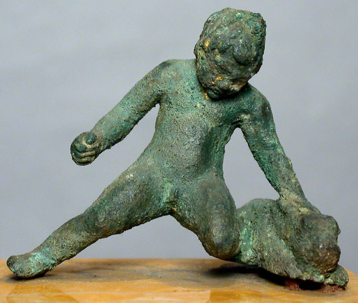 - Title: Bronze statuette of a kneeling boy holding a hare