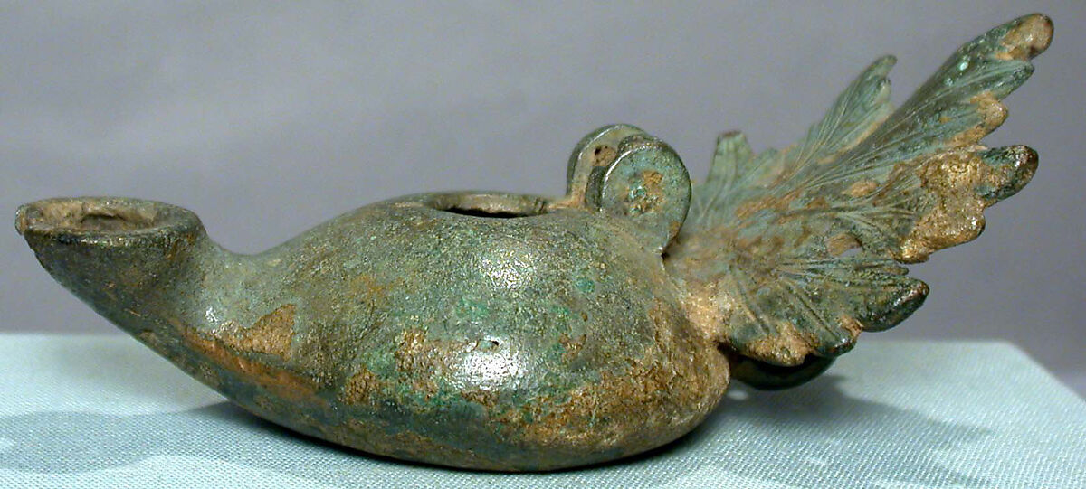 Lamps were used to light spaces in Roman houses and sanctuaries. This beautifully executed example has a round body, a projecting volute nozzle, and a thumb plate in the shape of a grape leaf.