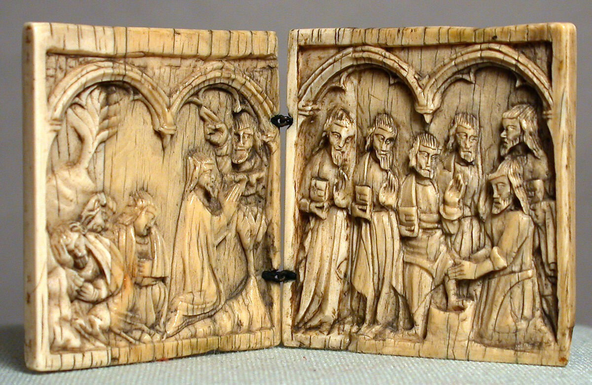 This diminutive ivory diptych represents two scenes leading to the Passion of the Christs, the washing of the feet of the Apostles and the Agony in the Garden. This iconography is unusual for ivory diptychs of 14th and 15th century northern Europe, which when adorned with a single scene normally represent the Epiphany, Passion, and the Virgin and Child. This unusual iconography, the irregular frame, and small dimensions suggest that the diptych is composed of fragments of a larger ivory plaque that represented scenes from the Passion. It is likely that such a plaque was sawn into pieces and reassembled sometime after its creation, perhaps by a later owner seeking to salvage elements after damage.