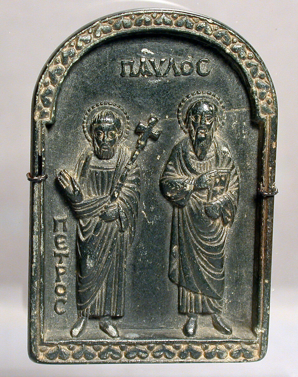 Saints Peter and Paul appear on this steatite plaque holding their symbols, a cross and a book. The haloed saints, founding fathers of the Christian church, are celebrated together on June 29. Exquisitely carved steatites were popular in the Byzantine Empire from the twelfth to fifteenth centuries. This work is an outstanding example of the later period.