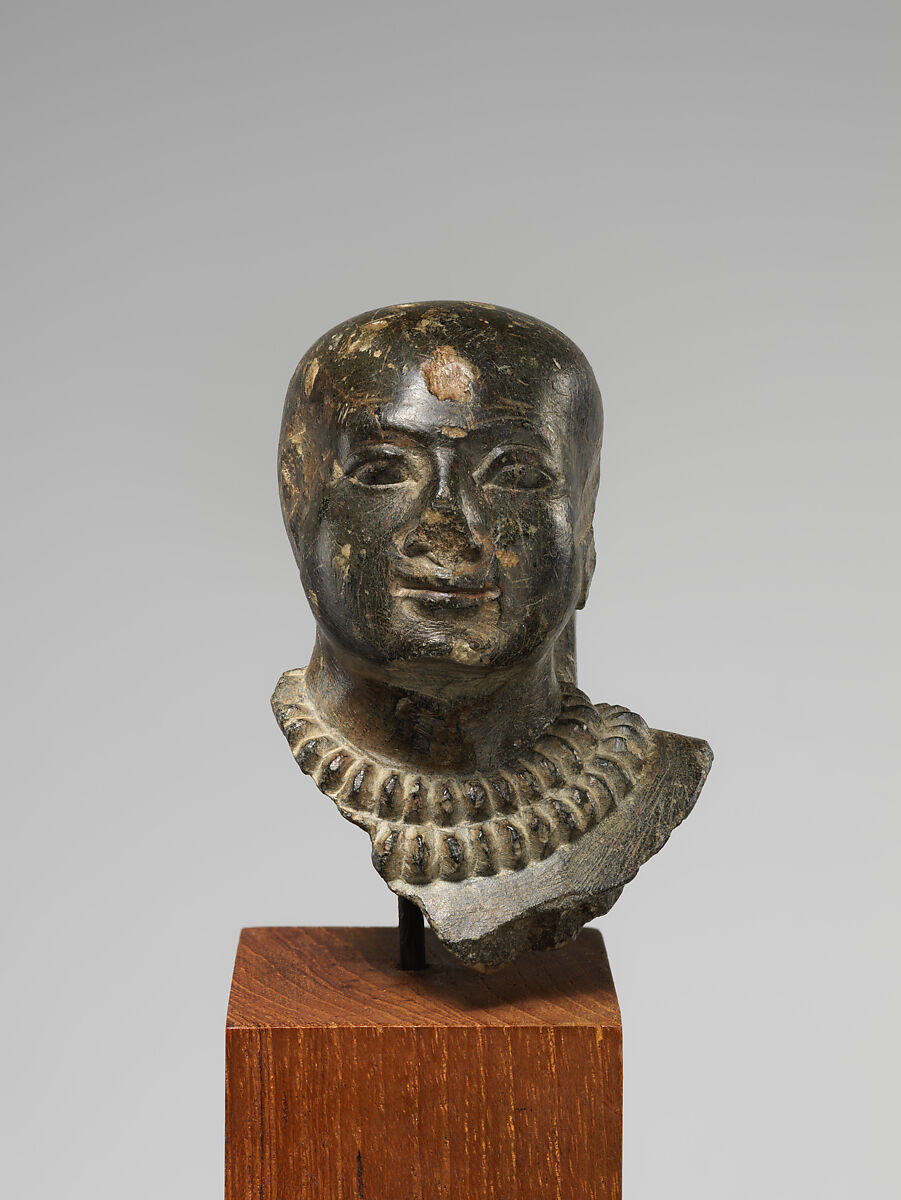 This head came from a small statue of a bald-headed man that was most likely placed in a funerary shrine to receive offerings or graced a temple so the individual resided in a god’s presence. The back pillar displays the beginning of a classic offering formula used on statues for both of those locations, but a small statue of a similar type was found in a deposit associated with a large temple. The double collar of ring beads, known as shebyu, indicates that the statue represented a favored official. The deliberate damage to the nose and both ears indicate evidence of a potentially iconoclastic episode