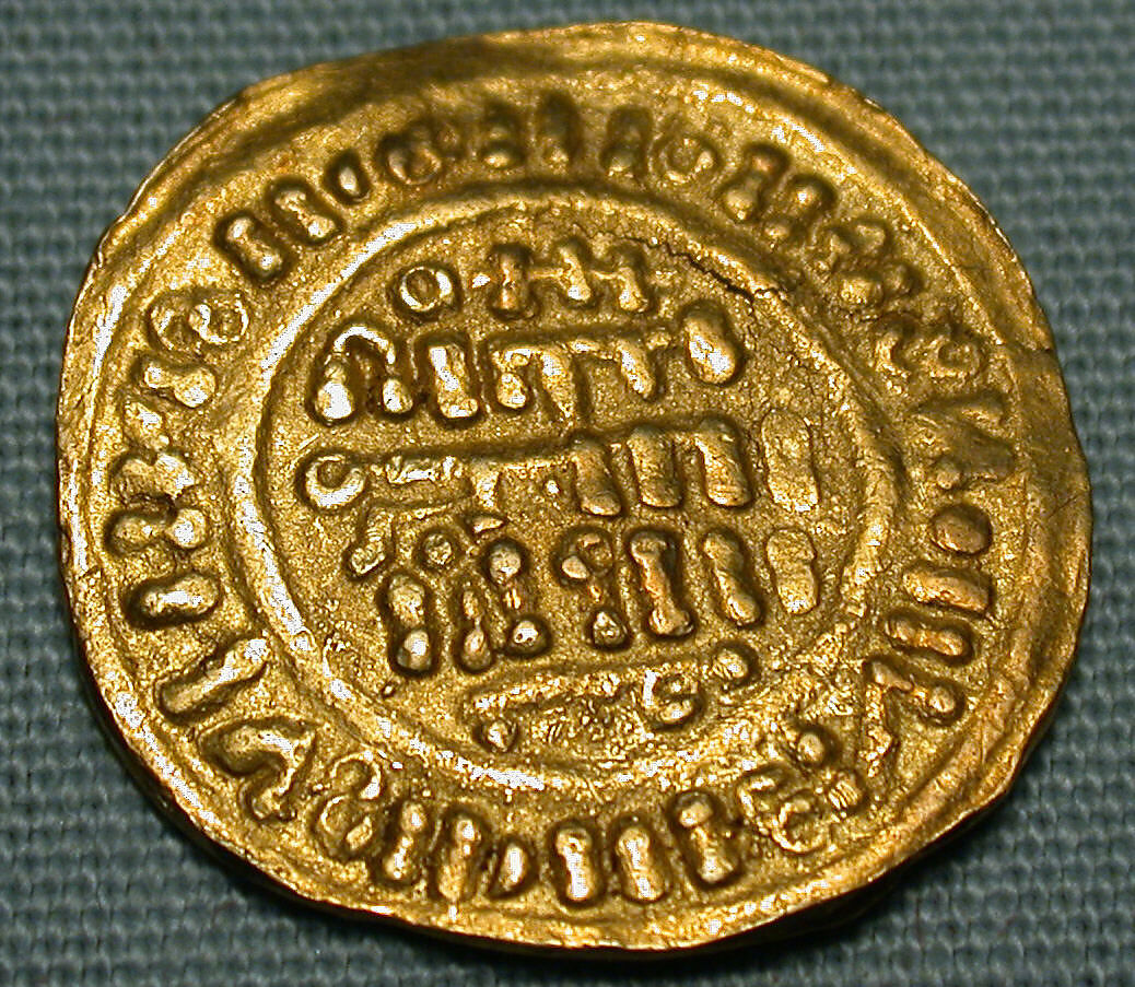 The format of this gold coin follows the typical epigraphic lay-out of medieval Islamic coins with a few differences. The inscriptions at the center, although not fully decipherable, are in Arabic (possibly pious phrases including the name "Muhammad" and "La Ilaha illa allah" while those on the borders are in a combination of Arabic and Roman letters. The typical double stops and symbols of the writing in the borders resembles that of European pennies, particuarly Spanish denaros. Although the vertical line at the left on the reverse is a characteristic of Muluk al-Tawa'if issues of the 11th century, the "degenerate" script and hybrid nature of the inscriptions on this coin suggest that it is likely a later imitation of the 11th century Spanish coin.