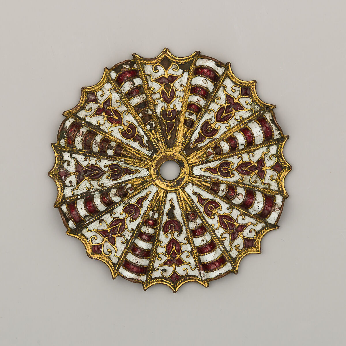 This large circular copper alloy plaque, cast with scrolls in faux-filigree and enameled, would have probably adorned a horse harness. A central rivet fixed it to the leather or textile while the two small holes, pierced on the top border, would be used for sewing it to its support so it could stay flat despite its weight.