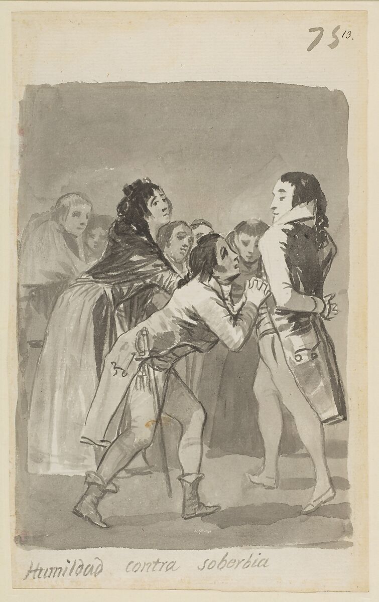 The captions referring to contrasting moral conditions on either side of this sheet form a linguistic bond. As with many of Goya’s captions, however, they relate to the images obliquely, generating questions rather than describing. The haughty man at right here has been identified as Napoleon Bonaparte. He approaches a group of figures who adopt various attitudes: obsequiousness, humiliation, fear, and curiosity. The other drawing on the other side of the sheet (35.103.12) depicts what appears to be a pawn shop. In the foreground, a woman opens her mantle to reveal her elegant dress, while a young man secures a bundle. To whom the generosity and greed of the caption apply is not clear.