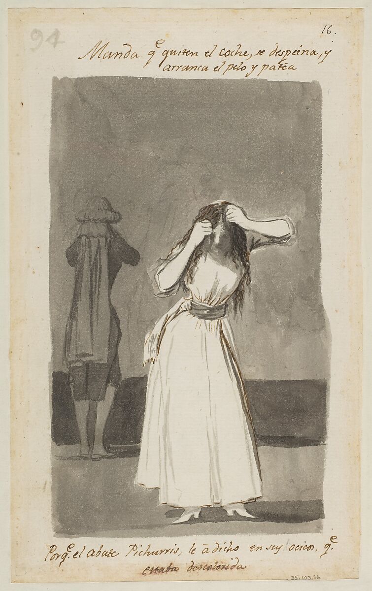 Woman throwing a tantrum and pulling her hair; folio 94 (verso) from the Madrid Album "B"