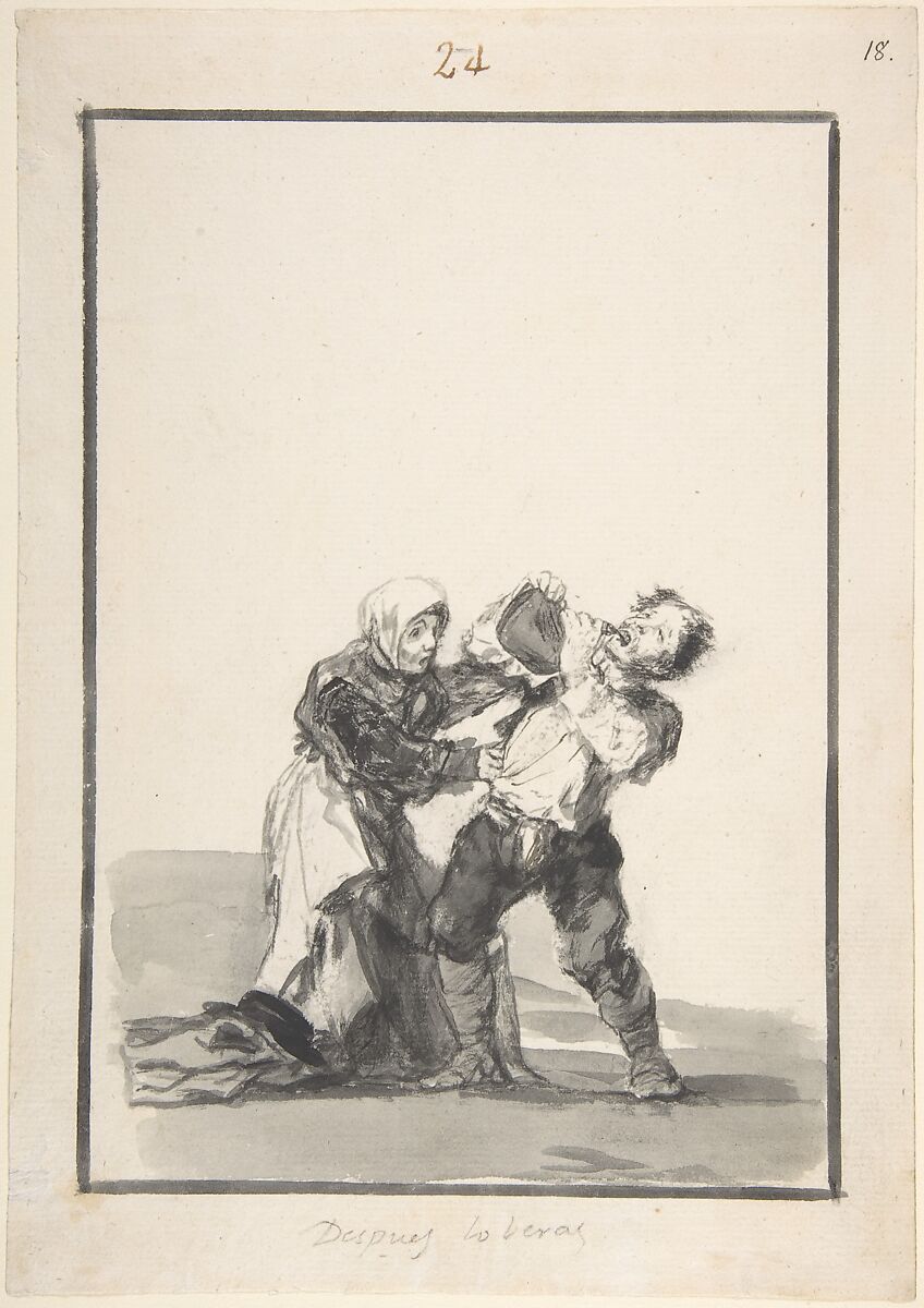 Drinking appears throughout Goya’s work, as a lubricant for social exchange, a metaphor for losing control, and a prelude to violence. In this drawing, a woman grabs at an inebriated man who, feet firmly planted and back arched, squirts wine into his mouth from a large skin. The caption complicates the subject. Referring to a future moment, it alludes to the outcome of the man’s uncontrolled drinking, but what might that outcome be? The woman’s alarm, expressed through her gesture, raised eyebrows, and open mouth, suggests it could be more than a mere hangover—perhaps something more insidious fueled by habitual activity that she is powerless to control.