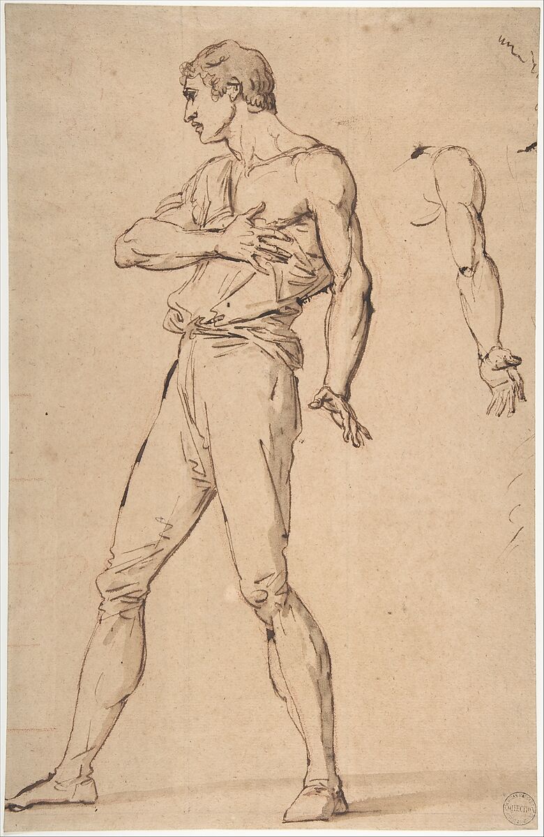 This sheet is a study for the figure of Cinna, who appears in Vincent’s 1787 painting The Clemency of Augustus as the grateful recipient of the Roman emperor’s mercy. In the compositional study (see 1985.245.2), Cinna is drawn in the same pose, nude, while in the finished painting, he wears classical garb. In this quickly executed sketch, Vincent drew the left arm a second time, experimenting with the position of the hand.
