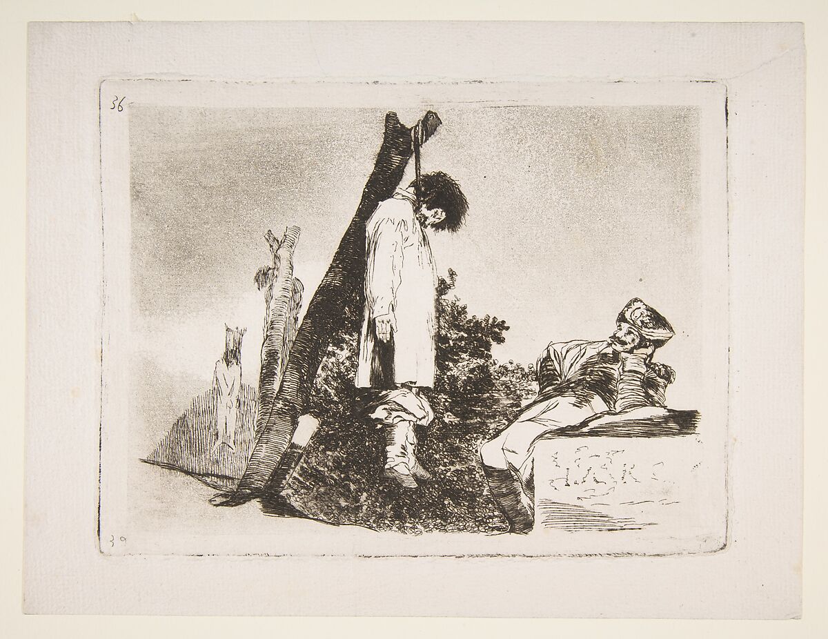 The empty roads of the Spanish countryside became the improvised setting for summary executions by both sides during the Peninsular War. Shooting or, as illustrated in this print, hanging from trees was carried out on the spot. Here, Goya created a triangular composition, with the body of the hanged prisoner falling at its central axis. The victim’s pants have slipped down his legs, emphasizing both the effect of gravity and the haphazardness of the execution, in all likelihood carried out with his own belt. A Napoleonic soldier leans on a stone bench, contemplating the scene with indifference. The caption relates to the scene of garroting that immediately precedes it: "One can’t tell why."