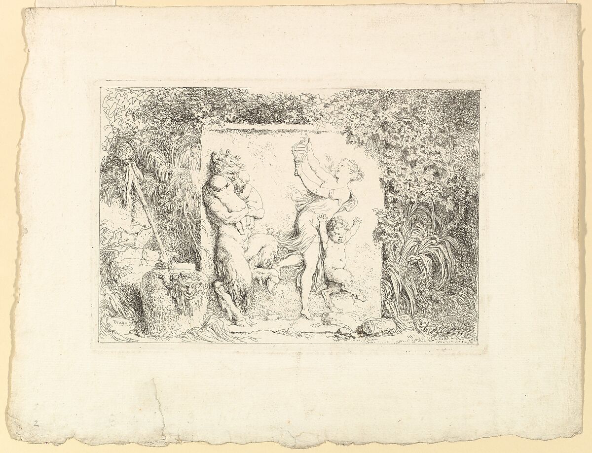 In this print set of four etchings (see also 1996.238.1-3), Fragonard presents playful bacchanalian scenes in the form of ancient stone reliefs framed by lush, sun-dappled greenery. Whether the reliefs are based on actual antiquities (as was long assumed) or are products of the artist’s imagination, the result is a tour de force of etching. The satyrs, the nymphs, and their offspring are imbued with a convincing sense of animation that belies the conceit of the compositions as depicting time-forgotten relics.