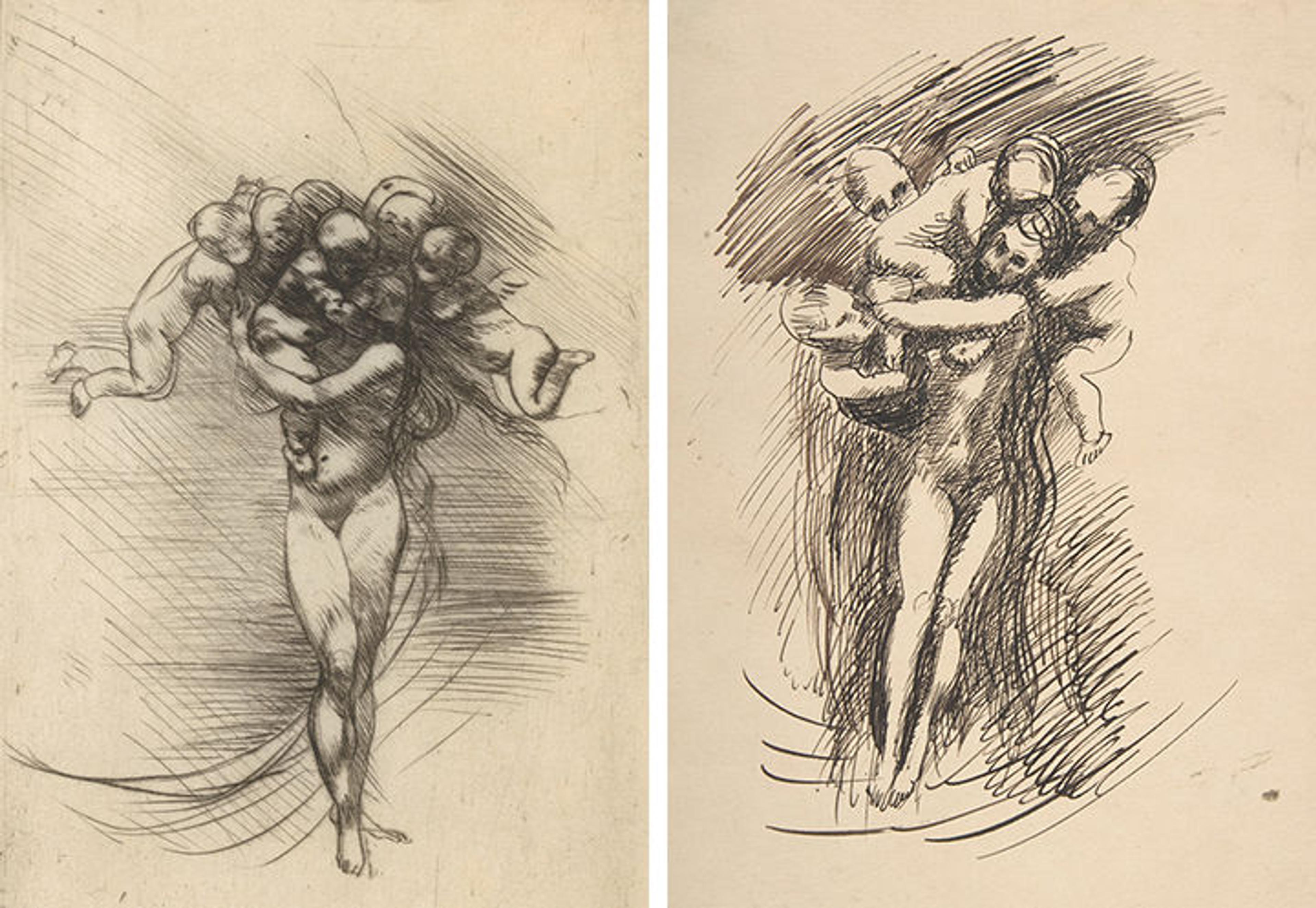 When Rodin was pleased with a sketch from life, he copied or traced the composition onto a new sheet, adding washes for skin tone and hair color. He might then rework the drawing further by reinforcing certain areas with graphite and highlighting with watercolor and gouache. In this example, the artist maintains the tenderness of the couple’s embrace while creating a sense of vibration and energy through vigorous graphite strokes and yellow and blue watercolor mixed with gouache.