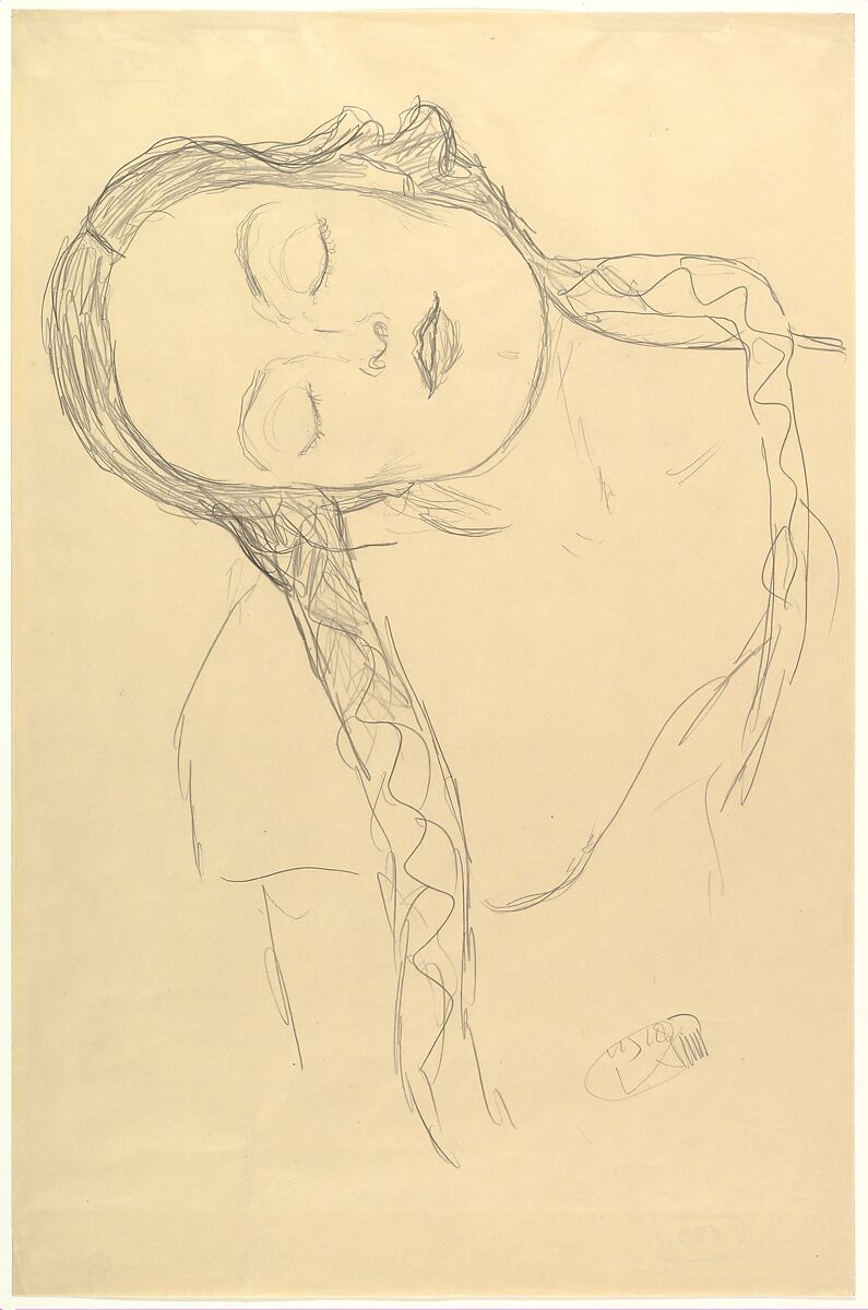 Rapidly executed during Klimt's late period, this sensuous drawing belongs to a large group of works that focus on women, strongly recalling the central figures in the paintings The Maiden (1912-13; Národní Galerie, Prague) and The Bride (1917-18; private collection, on loan to the Österreichische Galerie Belvedere, Vienna). Klimt was known to draw for many hours each day, often experimenting extensively with a single motif, such as the one seen here, of a woman with her head resting languidly