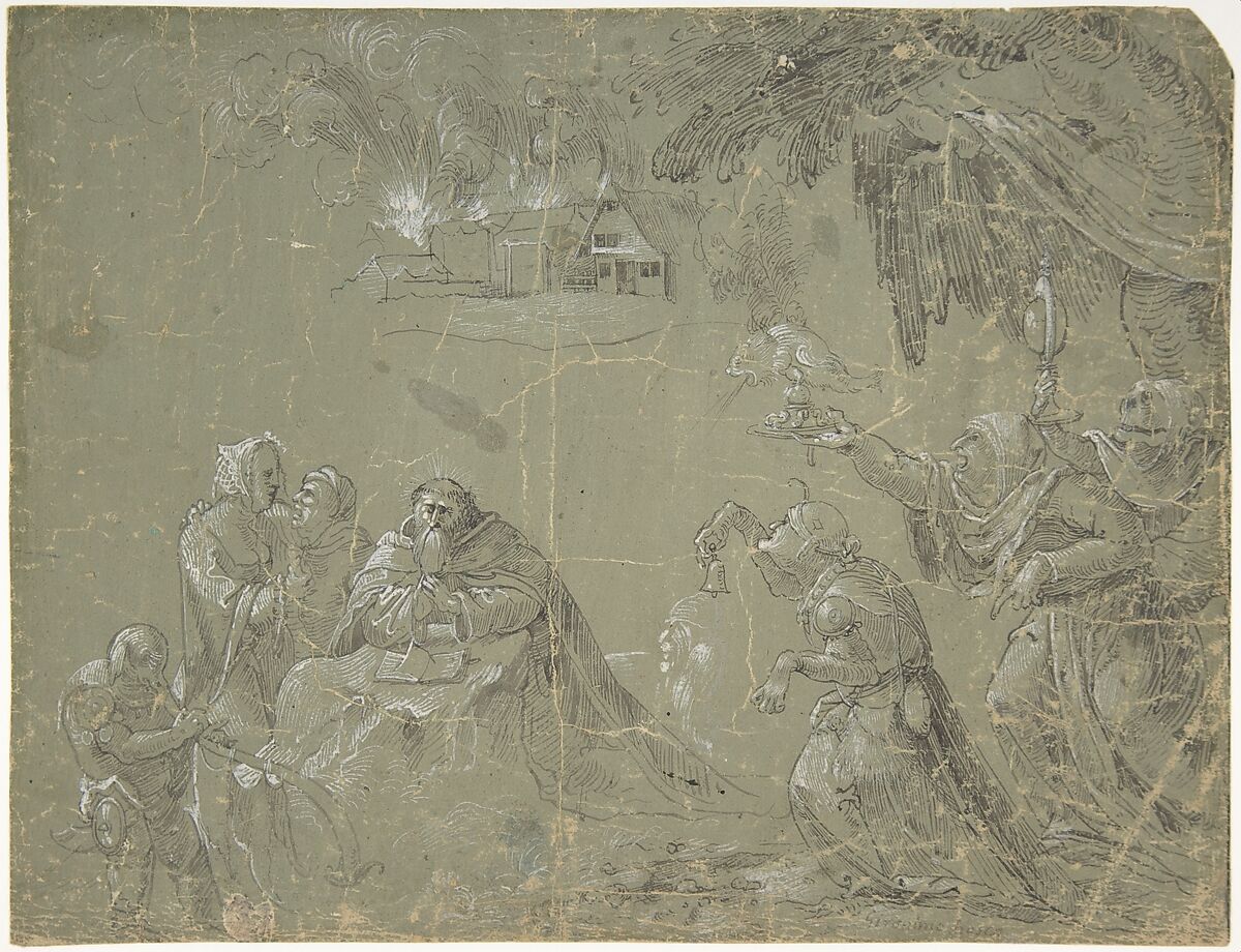 This drawing depicts motifs associated with representations of the Temptation of Saint Anthony. The bearded saint kneels in prayer before a rock supporting a book, resistant to the torments and temptations offered by the surrounding figures. A couple approach Anthony from the left, while a variety of demons proceed past a tree toward him from the right. Though the image of the saint, his tormentors, and the burning building behind are in proper proportion to each other, they are not contiguous. The prominent, undefined areas of empty space on the sheet and the lack of relationship between the foreground figures and background, in particular, suggest that these motifs were not conceived in preparation for another work but were copied from an unknown source. The drawing style is consistent with works associated with Jan Wellens de Cock, an Antwerp-based painter and draftsman who had close ties to the Mannerist school in the early sixteenth century. The arrangement of motifs on the Museum's sheet is similar in conception to a 1522 woodcut by de Cock depicting the same subject.