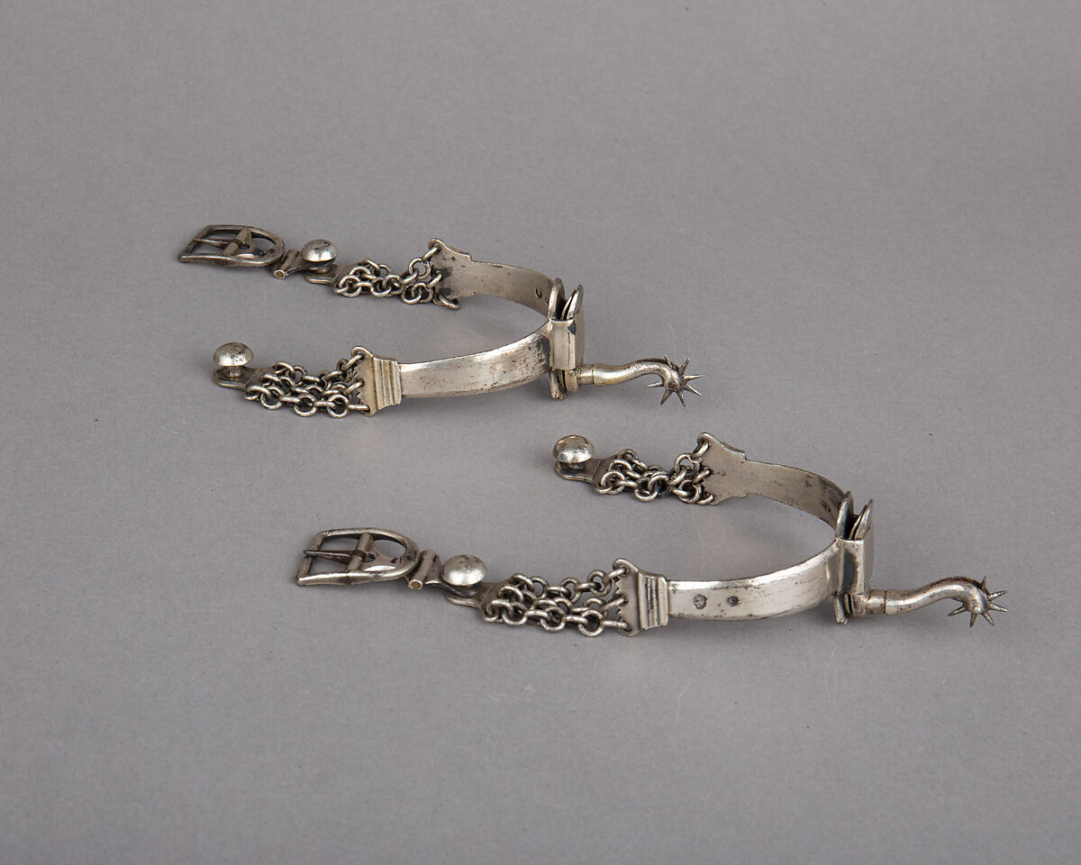 These spurs are entirely made of silver, except for a screw in the heel, the rowel and the buckles' prongs, made of iron, silver being too soft and fragile to be used for these parts.