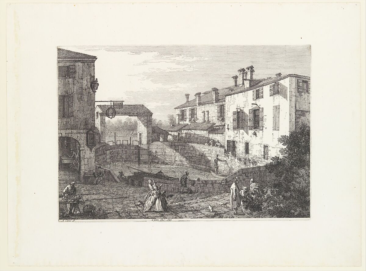 - Title: The Locks at Dolo, an oval-shaped basin with boats at center, buildings on either side, a fruit vendor and groups of figures in the foreground, from "Views" (Vedute altre prese da i luoghi altre ideate da Antonio Canal)