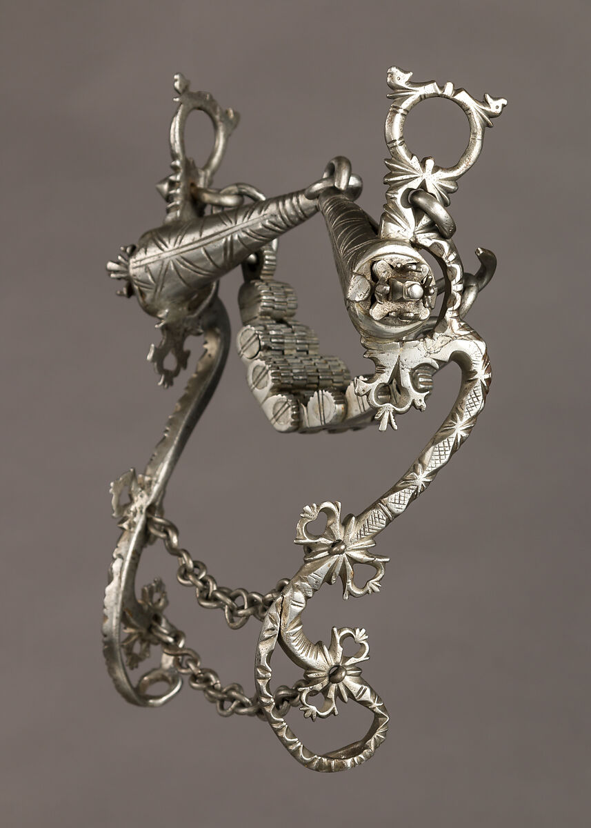 This kind of bit, with its engraved, pierced and chiseled ornamentation, is a very common type of German 17th-century bit, found in many collections. They might have been pre-made generic bits, mounted with mouthpieces and shanks of regular strength suitable for most horses.