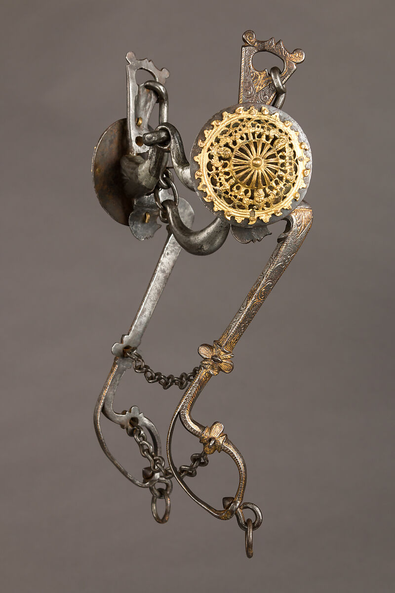 The cheekpieces are entirely adorned with chiseled and stamped decoration, partly gilded, also found on other mid-17th century Netherlandish and German equestrian material such as spurs.