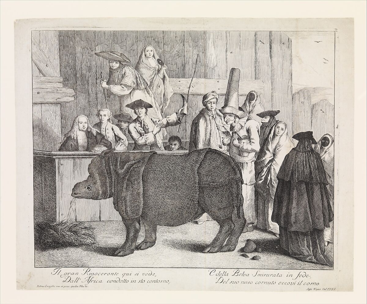- Title: The Rhinoceros, Clara, in the foreground, her keeper holding her horn and a whip behind her at center with various other spectators in Carnival masks