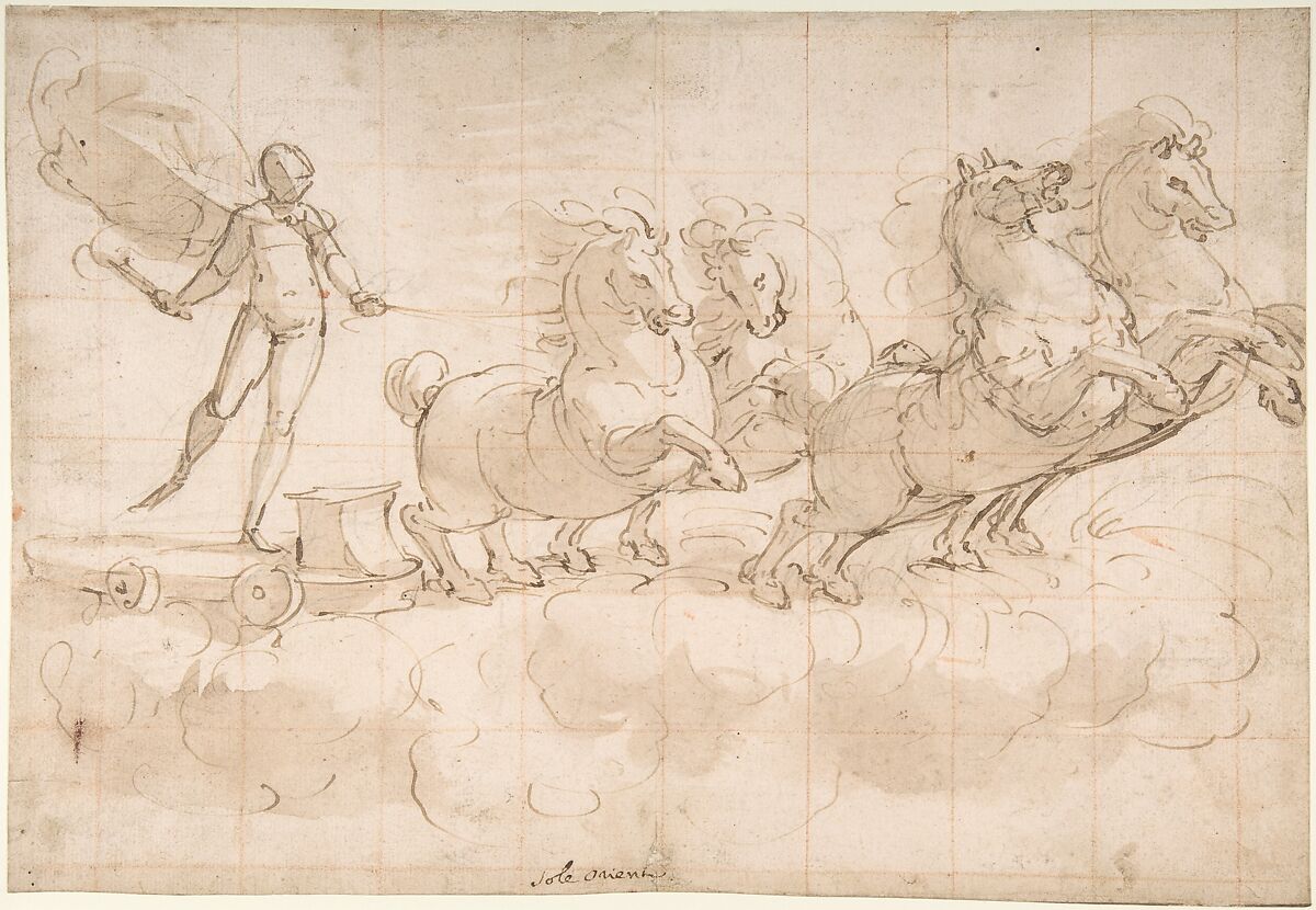 This composition drawing depicts Apollo, god of the sun, driving the chariot of dawn seen in a relatively frontal view. The sheet is inscribed "sole oriente," to indicate the rising of the sun on the east. Since the ink of the inscription appears to be of the same hue as the darkest passages in the outlines of the drawing, this could be an iconographic inscription by the artist himself. A companion drawing, representing the chariot of Apollo (erroneously identified as the chariot of Phaeton), but seen in a view from behind to indicate the setting sun on the west, is inscribed in a complementary manner, "sole cadente." It sold at Sotheby's, London on May 21, 1963, lot 131. A copy of the "sole cadente" composition, incorrectly attributed to Antonio Tempesta, is in the Ecole Nationale Superieure des Beaux-Arts, Paris (Ancien fonds no. EBA 384). That design derives from an original by Luca Cambiaso as well.