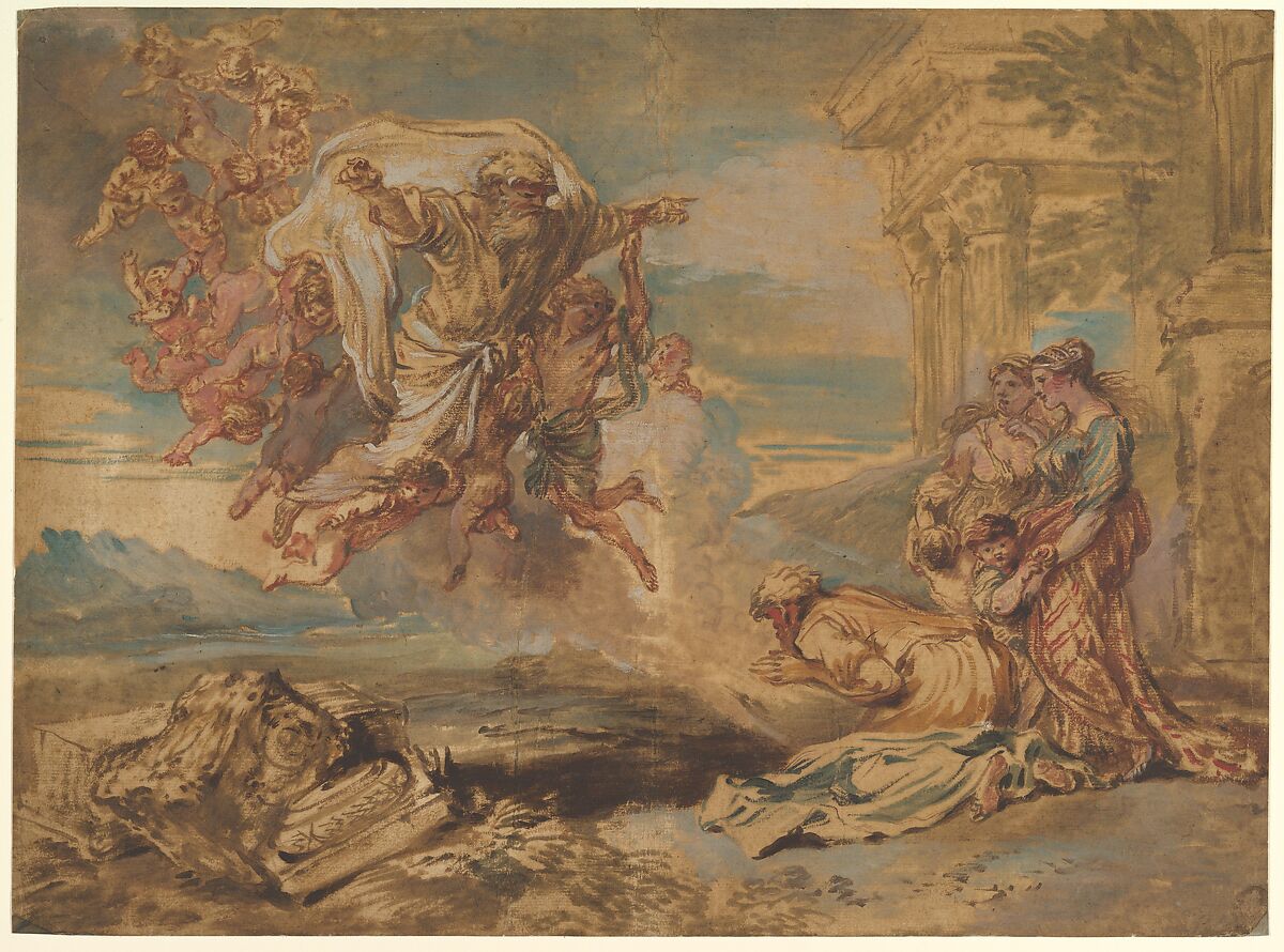 Castiglione is one the most innovative and technically brilliant draftsman of his time, a claim that is amply demonstrated through this drawing. He often made large compositions by working spontaneously on the paper, mixing different media to create an almost rough appearance that greatly enlivens the scene. Here, supported by angels and surrounded by putti, God appears to Jacob, who kneels on the ground accompanied by his two wives, Leah and Rachel, and two infants. Within this expansive landscape, the artist included a classical temple at right and fragments of architectural elements on the ground at left. They have nothing to do with the narrative scene but help balance the composition visually.