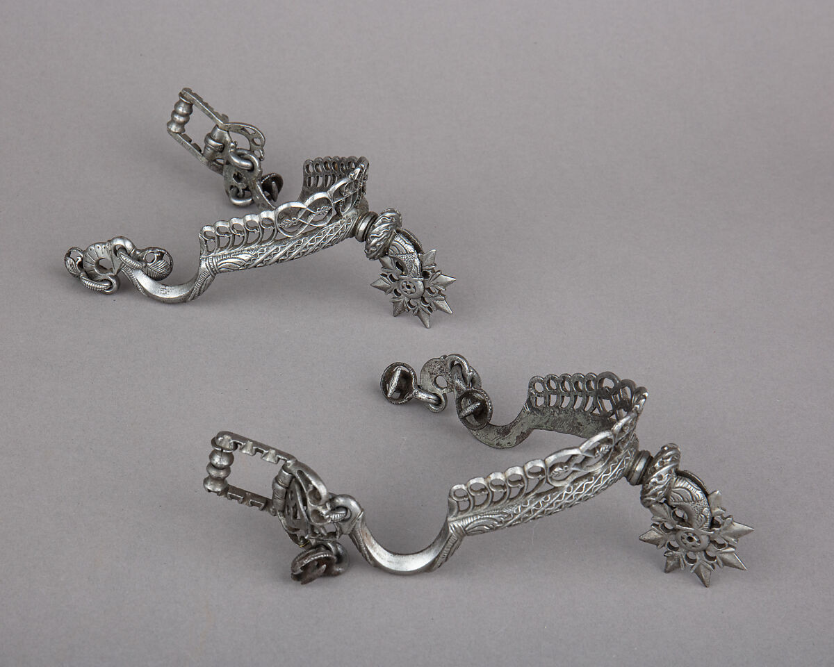 This pair of spurs is an ironwork masterpiece. They are entirely adorned with geometrical and vegetal chiseled and pierced decoration, giving them a rich and sculptural aspect. They were certainly worn and kept as pieces of jewelry as much as being used as practical equestrian objects.