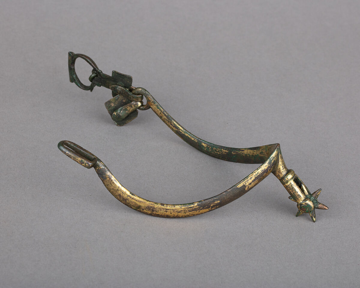 This spur belongs to the first type of rowel spur developed. The first rowel spurs, featuring a revolving disc or star at the end of the neck, appeared in Western Europe around the mid 13th century. They cohabitated with the earlier form, the prick spur, for about a century, before replacing it almost completely in Europe by the mid 14th century. The advantage of the rowel spur over the prick was it allowed the rider to reach the flanks of its horse with one of the points whatever the angle of its foot, which was very convenient regarding the riding position of the time, with long stirrups-leathers and extended legs. The fact that the rowel rolled against the horse instead of hitting it directly reduced also the probability of injuring it too seriously.