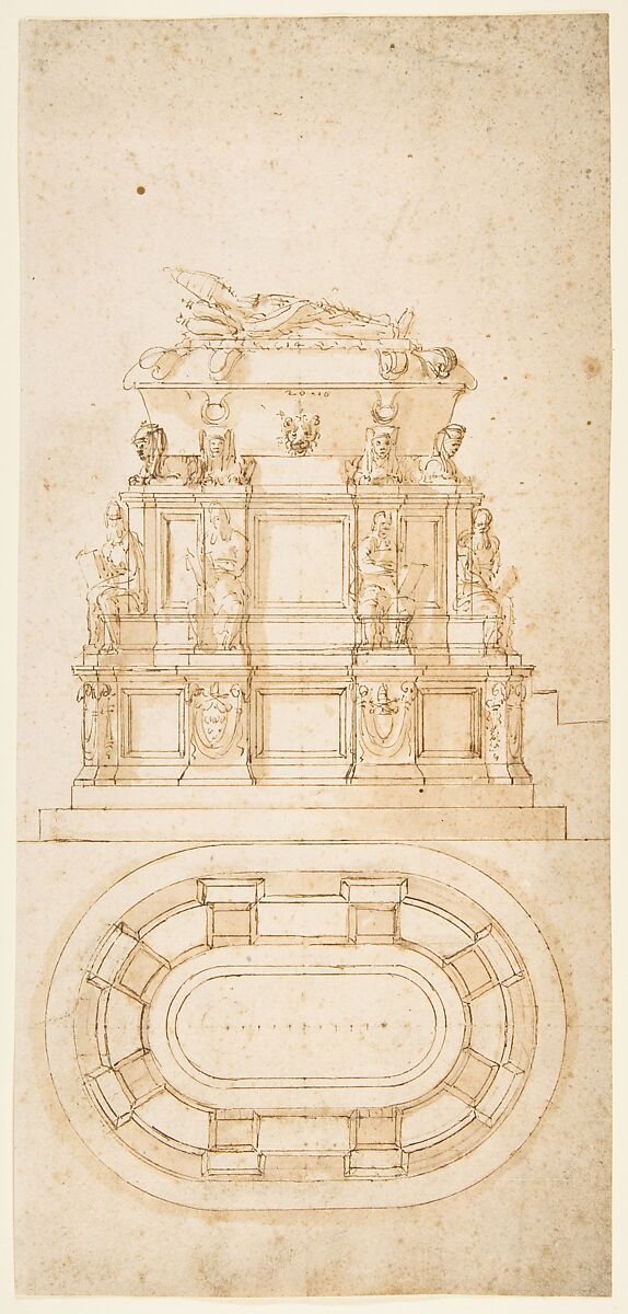 The present drawing depicts the effigy of a bearded pope and on the lower part of the podium includes the papal tiara with crossed keys over the Medici family’s coat of arms -- the six balls, or palle -- which readily identifies the funerary monument as that of Clement VII de’ Medici (1478-1534), elected pope on November 19, 1523. This detailed modello, or demonstration drawing, may be compared to Michelangelo’s 'Tomb of Pope Julius II' as emanating from the same general tradition of clearly expository designs probably intended for the patron. Here, Sangallo rendered the freestanding tomb to be carved in marble in a consistent, precisely calibrated projection of the elevation with respect to the plan. This distinctive technique of drafting the dimensions of the plan and side views of a form in exact relationship to each other was still quite new in architectural drawings of the time. The Metropolitan Museum sheet by Sangallo is executed in pen and ink with wash over an extremely precise construction of direct stylus-incisions ("incisioni dirette"), done with compass and ruler, and with measurements carefully pricked with calipers; the grids of stylus-ruled lines coincide from plan to elevation above. While the overall condition of this working drawing is good, it exhibits small, scattered discolorations of the paper, slight soiling from handling, some minute worm holes, and foxing toward the upper border of sheet. The sarcophagus in the elevation (upper) part of the drawing was inscribed by the artist with several measurements; the cushion supporting the papal effigy apparently indicates "14" (probably 14 palmi, or 3.12 meters); while the upper rim of the sarcophagus notes "20-10" (probably 20 palmi, 10 once, or about 4.6 meters); and the lion’s head "4-12" (probably 4 palmi, 12 once, or about 1.17 meters). Both the bold, freehand manner of briefly sketching the figures and the precise, stylus-constructed drafting of the architectural elements in the Metropolitan Museum drawing are characteristic of the hand of Antonio da Sangallo the Younger.