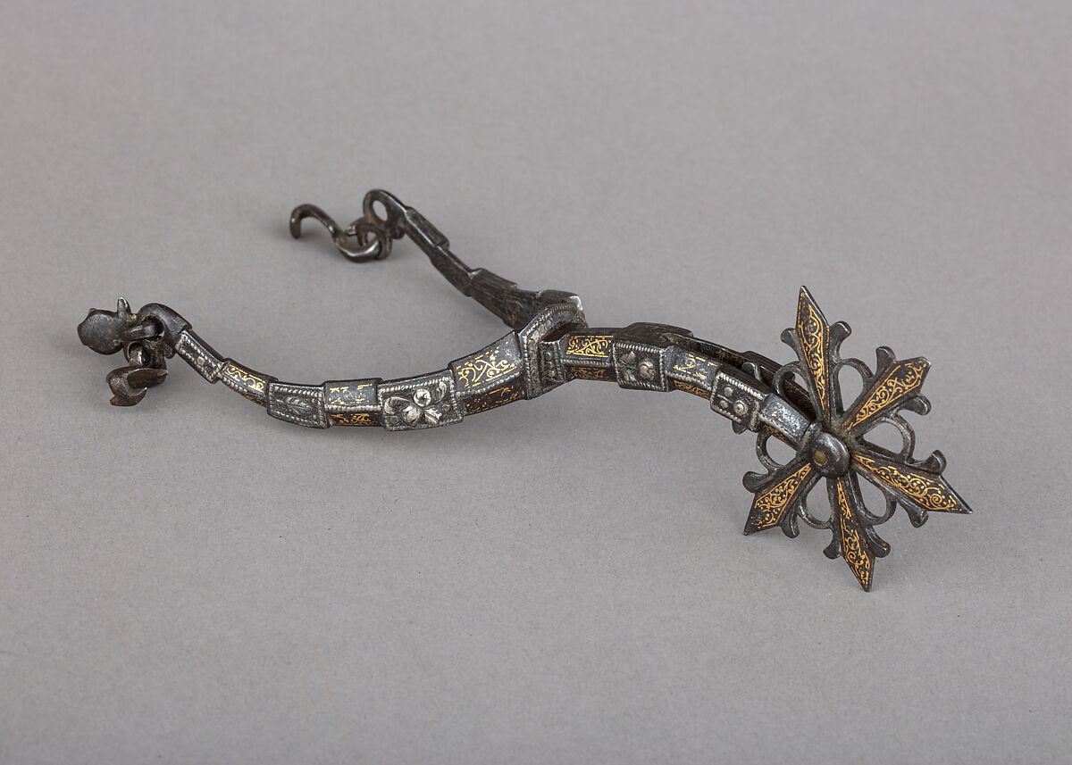 The particularly rich decoration of this spur features delicate gold damascened scrolls and rectangular medallions inlaid with silver roses. The insides of the branches are even decorated with silver damascened vegetal scrolls, standing out against a blackened background. This type of decoration is often found on German and British rapier hilts made in the early 17th century.