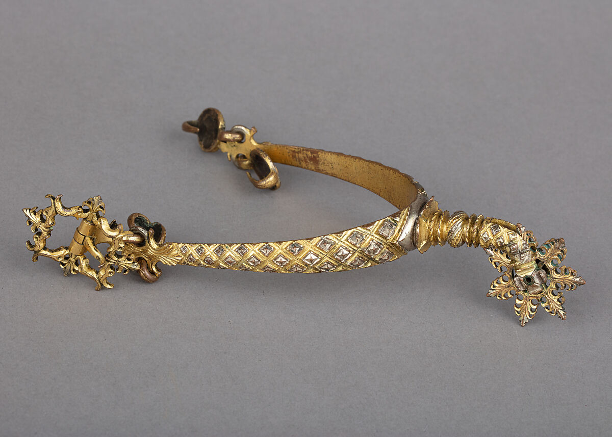 The neck and arms of this luxurious spur are chiseled all over with a diaper pattern, the faceted diamond bosses silvered on a golden background. The points of the fragile rowel are shaped as very delicate palmettes. The three circular tabs with hooks feature the gilded profile of a young boy with a ruff collar on a silvered background. These heads seem inspired by the medal of the Infante Carlos, son of Philip II of Spain, aged 12, made in 1557 by Pompeo Leoni.