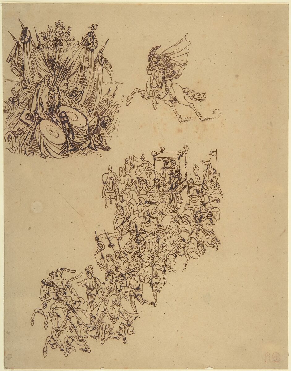 - Title: Sheet of Studies: A Marriage Procession in Sixteenth-Century Dress; a Cavalier; and a Trophy of Arms