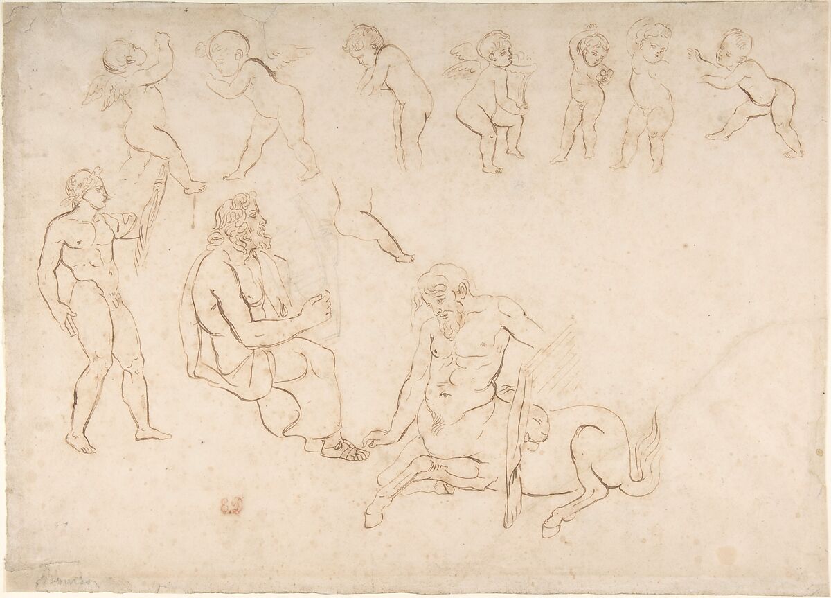 - Title:Studies for the decoration of the Library, Palais Bourbon, Paris: standing nude athlete; seated man with a lyre; centaur; and seven putti (three with wings)