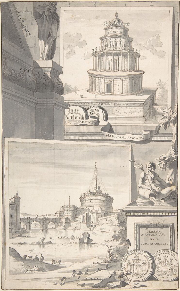 - Title: Reconstruction of the Mausoleum of Hadrian (above) and a View of the Castel S. Angelo (below)