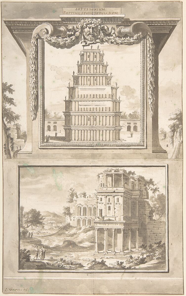 - Title: Reconstruction of the Monument to Septimius Severus (above), View of the Ruins (below)