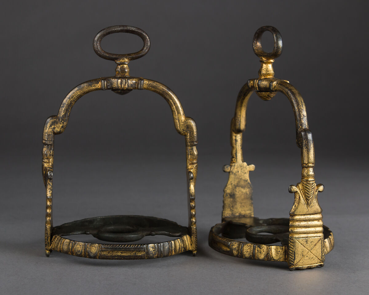 This shape of stirrups, evolved from 17th-century German types, became very popular in Spain in the 18th century. The swivel suspension eye allowed the stirrup leather to stay flat against the horse’s flank when the stirrup is in use, but it is more fragile than regular non-rotating systems.