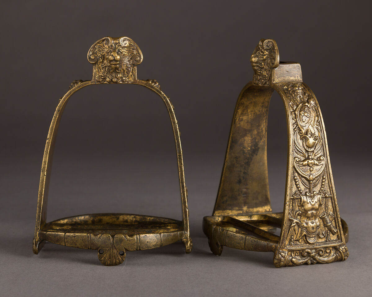 Each stirrup of this pair is adorned with trophies of arms on the sides and a lion’s head at the front of suspension eye.