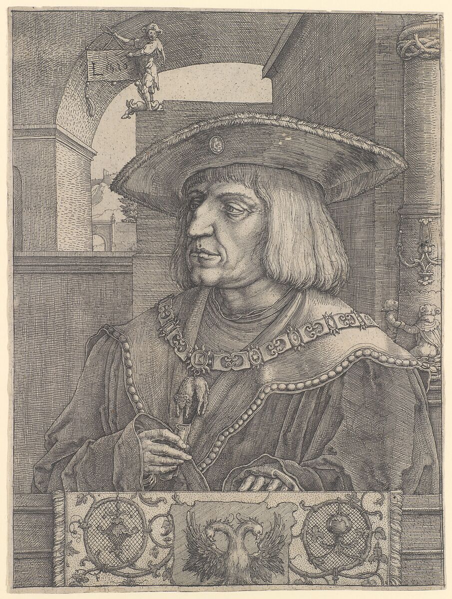 This sensitive portrayal of the Holy Roman Emperor Maximilian I, produced in commemoration of his death in 1519, is one of Lucas's most technically innovative works. It demonstrates how, for the first time in Northern Europe, an artist combined the techniques of etching and engraving. Etching allowed Lucas greater freedom of draftsmanship, but at the time the print was made, its use as a printmaking technique was still rather new. He therefore turned to engraving in the areas that required greater precision. Thus, the artist engraved Maximilian's face with very fine, sharp lines, but the less rigid, wavering, and slightly more animated strokes in the rest of the composition were etched.