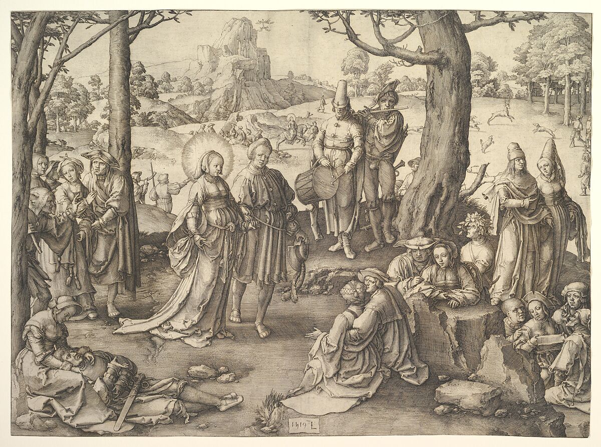 In this large and delicately engraved print, Mary Magdalene is depicted in her worldly life as a courtesan, prior to her conversion. In the foreground, among loving couples, she dances to the music of a piper and a drummer; a fool gestures to her from behind a tree on the left, mocking her sinful behavior. Just beyond, she is on horseback taking part in a hunt. Lucas provided few clues to the religious nature of the subject besides the halo surrounding her head and the minute depiction of her assumption into heaven (in the background to the right of the mountain). This episode in the Magdalene's life had few precedents in the visual arts but was popular in contemporary mystery plays.