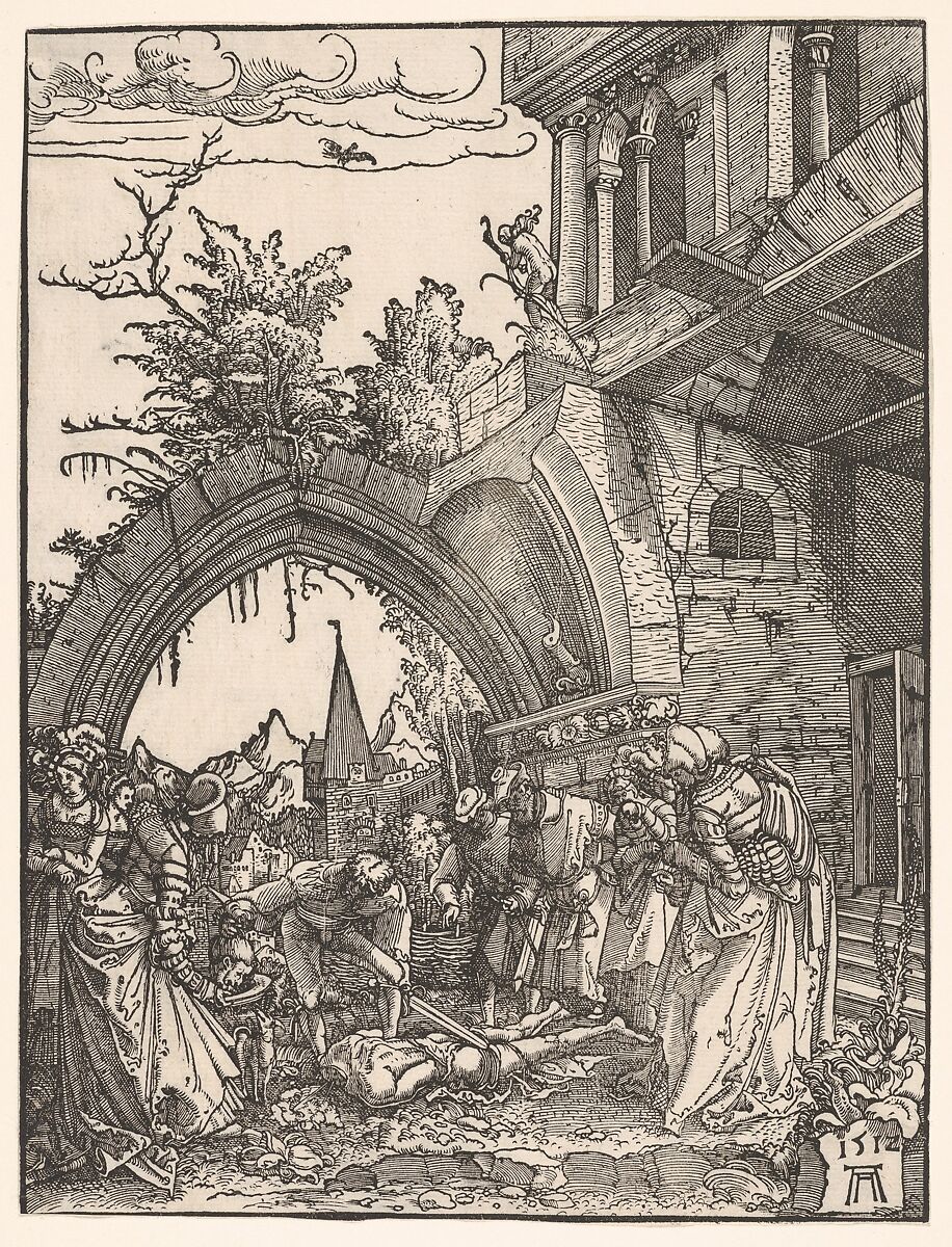 The head of the martyred saint is handed over to Salome by the executioner as a crowd looks on. The scene of Saint John the Baptist's beheading occupies only the lower third of the image. For Altdorfer, the architecture and surroundings were clearly just as important as the figures. The composition is a study in perspective, with even the onlookers arranged in a diagonal line that leads to a point just above Salome's head.