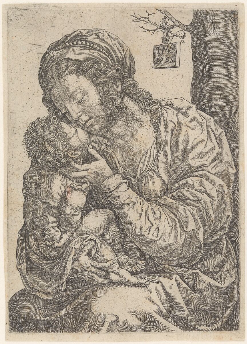 As he so often did in his paintings, Gossart combined Renaissance and Gothic motifs in his prints. Here, the figure types derive from Italian Renaissance sculpture. Most notably, the child's unusual gesture, with his arm turned backward, derives from The Madonna of the Steps, a relief by Michelangelo (1490–92, Casa Buonarroti, Florence). The nervous folds of the drapery are typical of Northern Gothic art. The theme itself derives from a number of prints created by Gossart's German contemporary Albrecht Dürer, who visited the Netherlands in 1520–21 and consequently inspired a number of Netherlandish artists to make prints after his work.