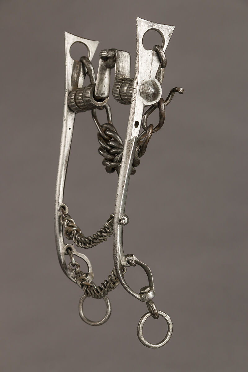 The mouthpiece would make this bit rather harsh, since, because of the central high port for the tongue, the ribbed rollers would rest directly on the bars (part of the horses’ jaw without teeth). Its severity would be also increased by its rigidity, since the central joint of the mouthpiece does not move and its sides not articulate with the cheekpieces. This bit was possibly used on a carriage horse.