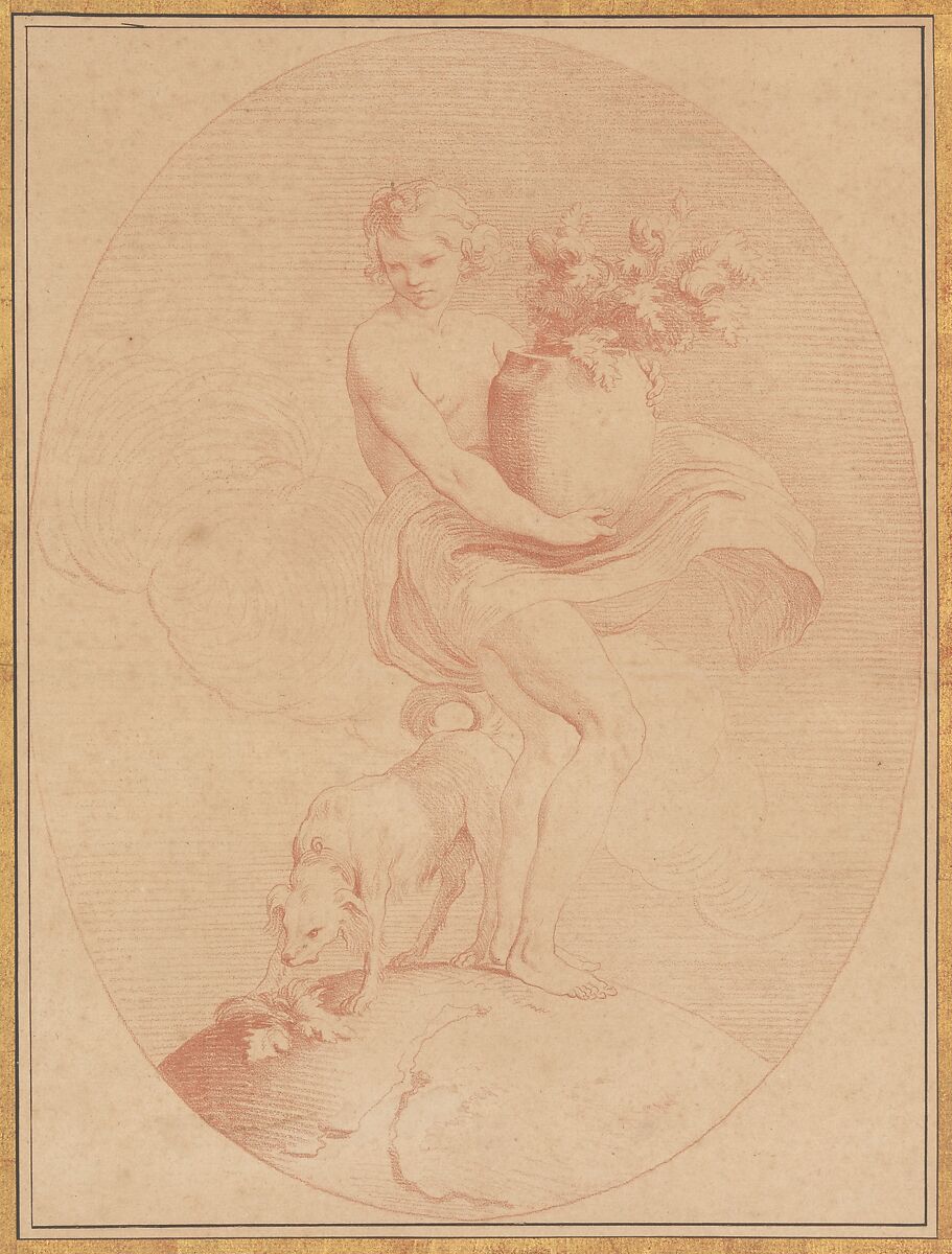 The solubility of red chalk, also called "sanguine" because its color is akin to that of sang ("blood," in French), makes it suitable for the creation of counterproofs. The only surviving counterproof in a set of five examples based upon Bouchardon’s unlocated drawings of the five senses, The Sense of Smell depicts a boy holding a flowering plant and a dog sniffing acanthus-like leaves for olfactory proof of a previous canine visitor. The horizontally oriented hatching that surrounds the central figure calls to mind the lines that Bouchardon, best known as a sculptor, made with his chisel when working in three dimensions. It also evokes the lines incised in metal plates used to make etchings and engravings, which, like counterproofs, replicate their originals in reverse.