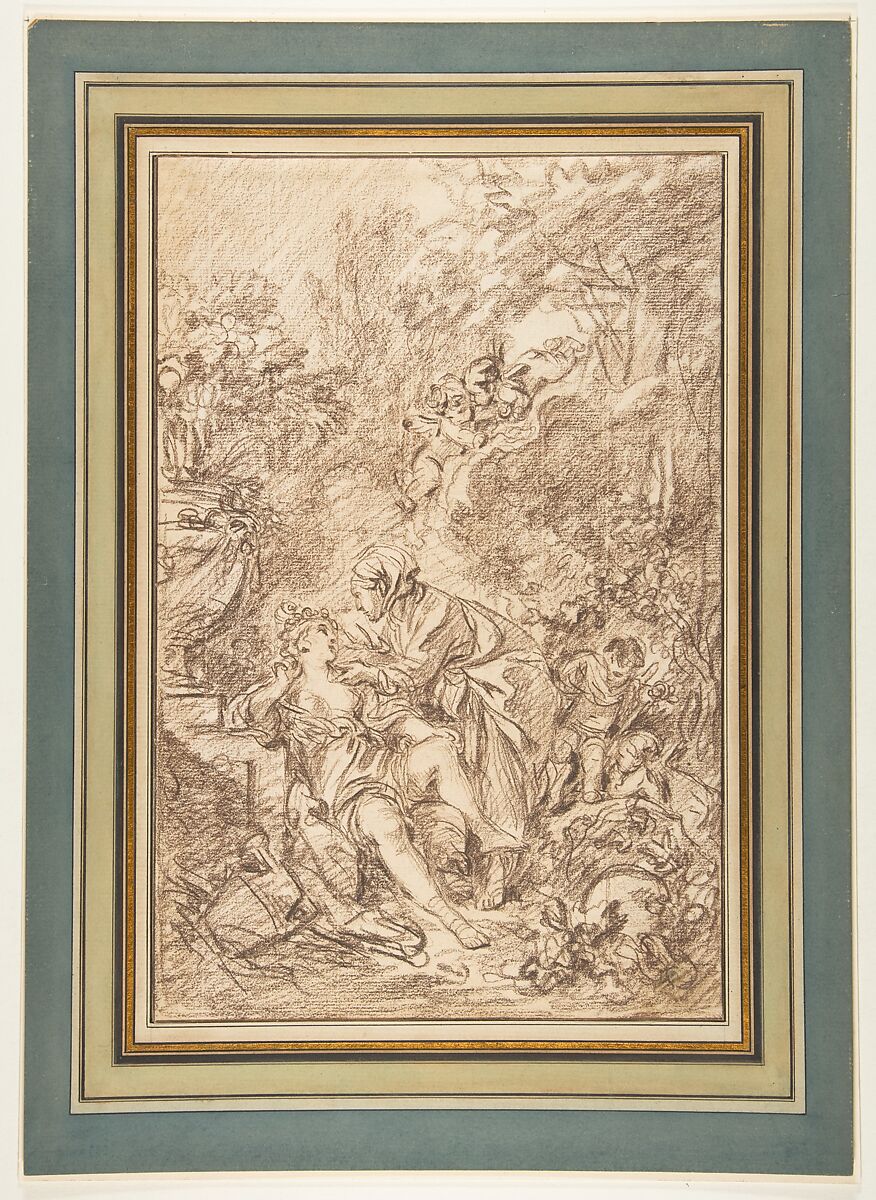 Boucher depicts here a well-known story from Ovid's Metamorphoses. Pomona, the Roman goddess of fruit, was so devoted to her orchards that she took no notice of suitors. The god Vertumnus transformed himself into the form of a ragged old woman to gain her confidence. Boucher was fond of the subject and had already portrayed it on several occasions, including an overdoor for the royal Château de la Muette in 1749, a design for the Beauvais tapestry manufactory in 1757, and within an oval medallion for the Gobelins tapestries woven beginning in 1764 for Croome Court. In his virtuouso manner of handling the chalk, Boucher is here akin to Jean-Honoré Fragonard, his most famous student.