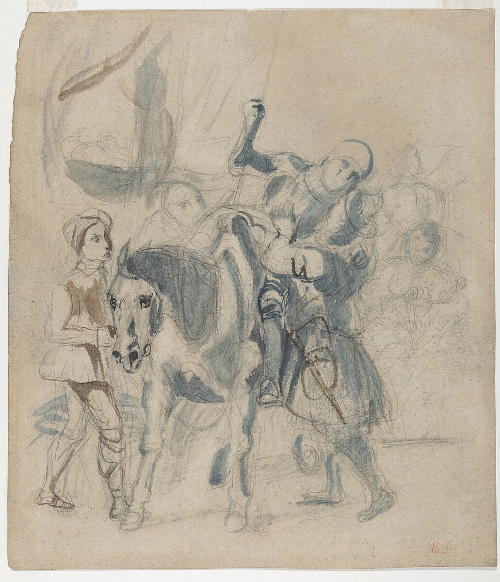 Delacroix was fascinated by Goethe's "Goetz von Berlichingen," the tale of a late medieval knight (translated into French in 1823). In an 1827 sketchbook he listed seven possible subjects based on the story, including "Goetz arrives wounded on his horse among the gypsies." This loose wash drawing is the only known compositional study for the lithograph he produced of the scene. Delacroix worked on the series intermittently from 1836 to 1843, eventually completing seven designs, but never published the lithographs as a suite.