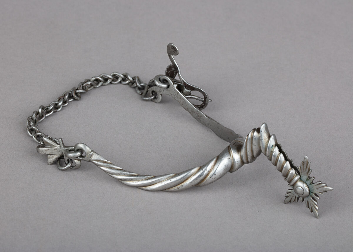 Despite its simple shape this spur is skillfully chiseled all over with a rope motif giving it a particularly sculptural aspect. Necks bent at an angle like this were popular in Europe between 1630 and 1660.