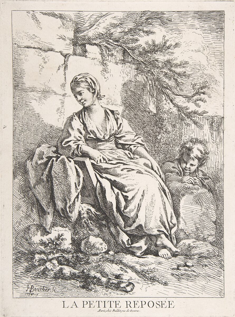 Although he worked primarily as a painter and draftsman, Boucher found early employment as a printmaker, making etchings after the paintings and drawings of Antoine Watteau. He also etched around thirty compositions of his own designs. La Petite Reposée is one of his more ambitious efforts in this medium. The rather static composition of a young woman and a boy placed before a rustic wall is enlivened by Boucher's very free use of the etching needle.