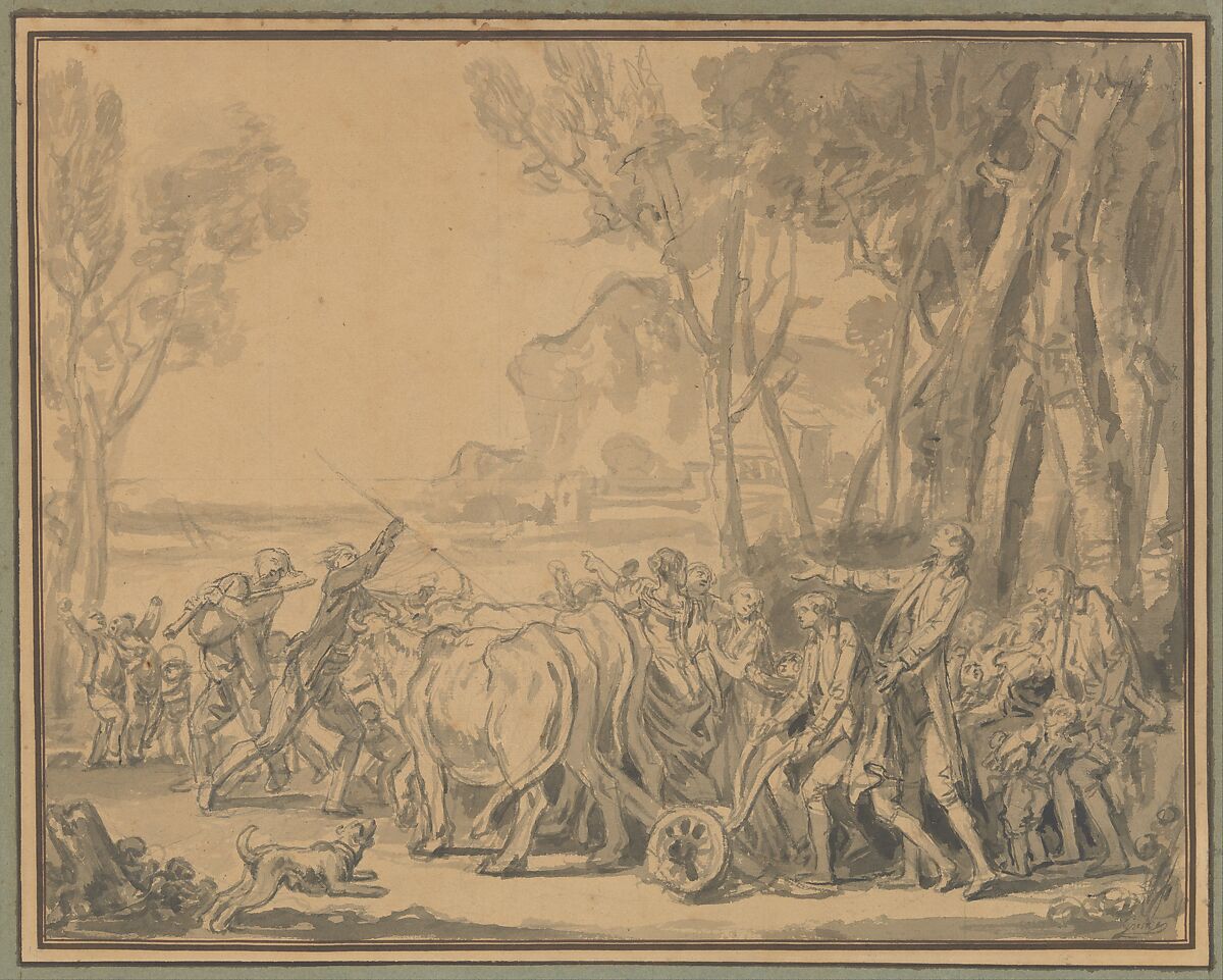 - Medium: Brush and gray wash, over graphite; squared in graphite; framing lines in pen and brown ink. Verso of mount: figure in brush and gray wash