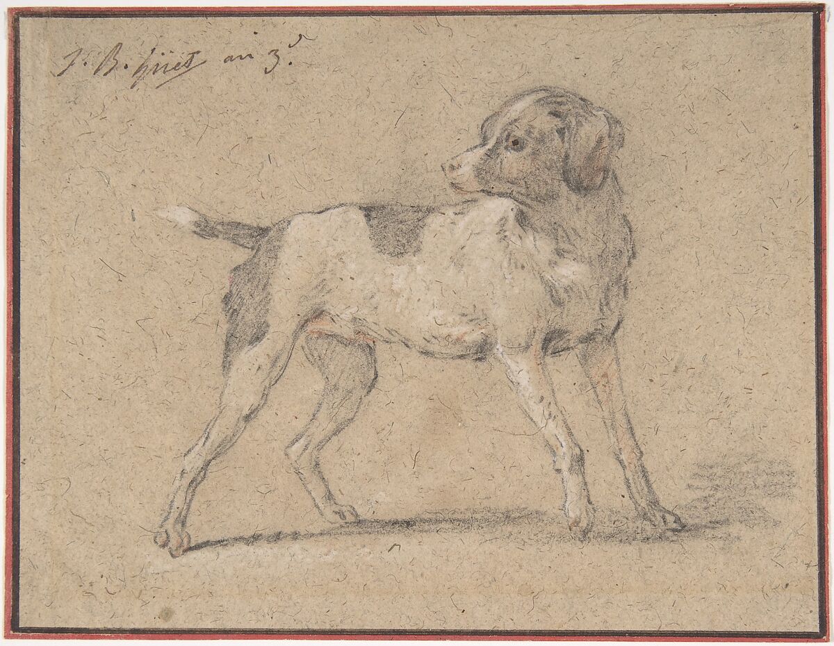 A distinguished animal painter, Huet here reveals the lightness of his touch as a draftsman. After sketching in the outlines of this small dog in black chalk, he used white to suggest the texture of fur and red to define the sensitive ares of ears, eye and nose. The animal is caught in midstride with its front leg raised, with the ground indicated only by a slight shadow. The signature and late date indicate that he drawing is an autograph copy of an earlier work made about 1765.